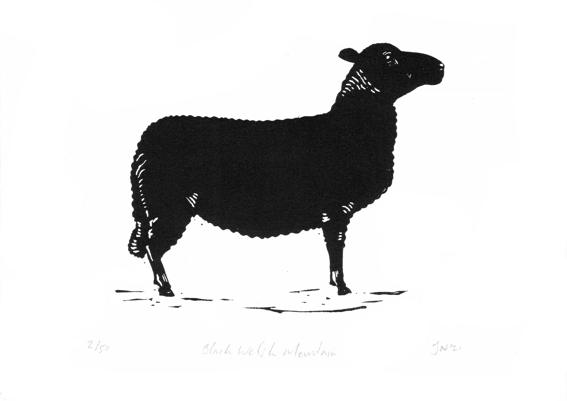 All new for winter 2021, a handmade limited-edition of the beautiful and noble rare breed, the Black Welsh Mountain Sheep linocut print.