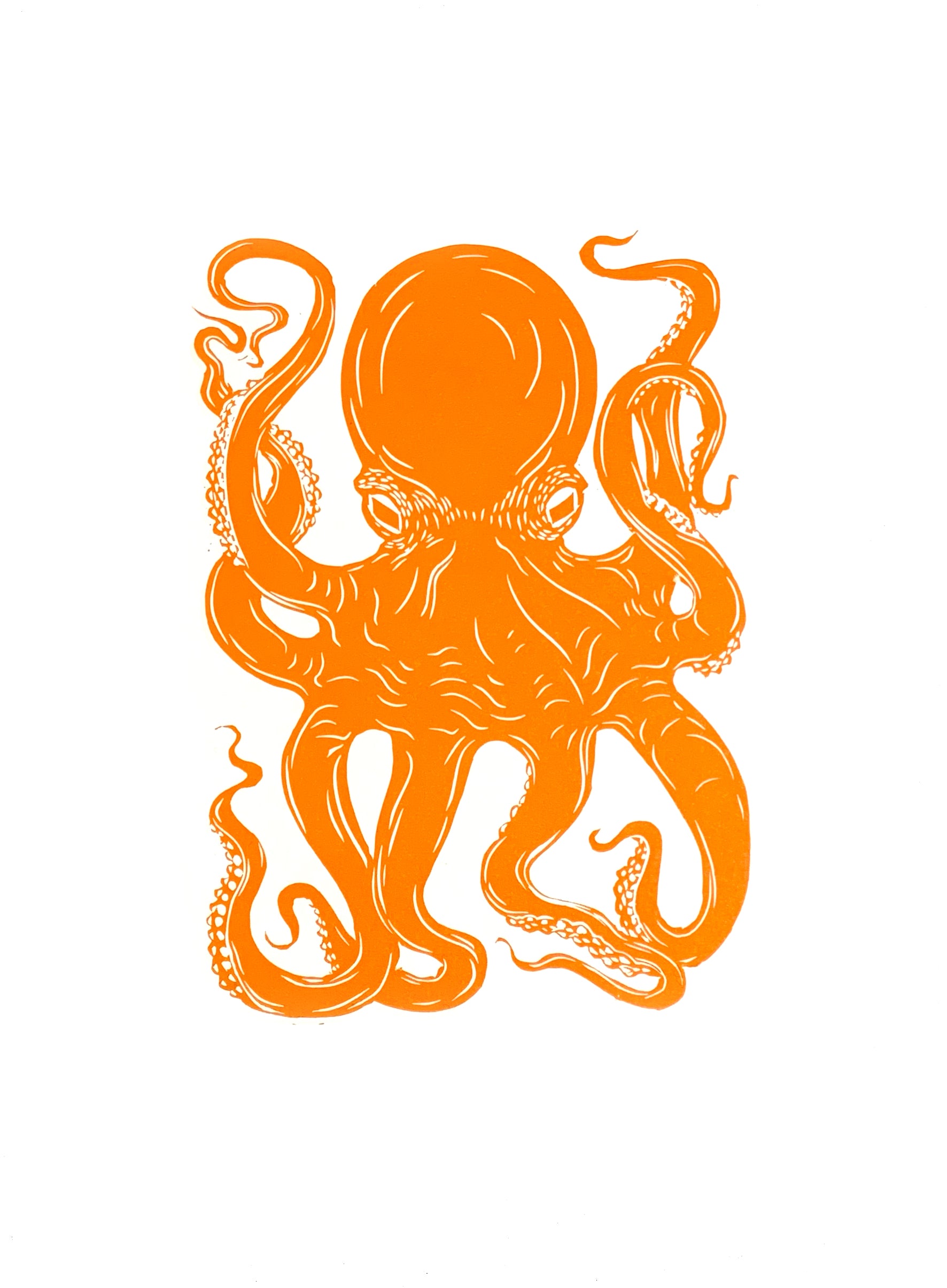 All new for winter 2021, a handmade limited-edition linocut print of a small and exceedingly affordable Octopus, for those that don't have the space or the dosh for one of my big octopuses. Think of this one as the gateway drug for your burgeoning octopus habit.