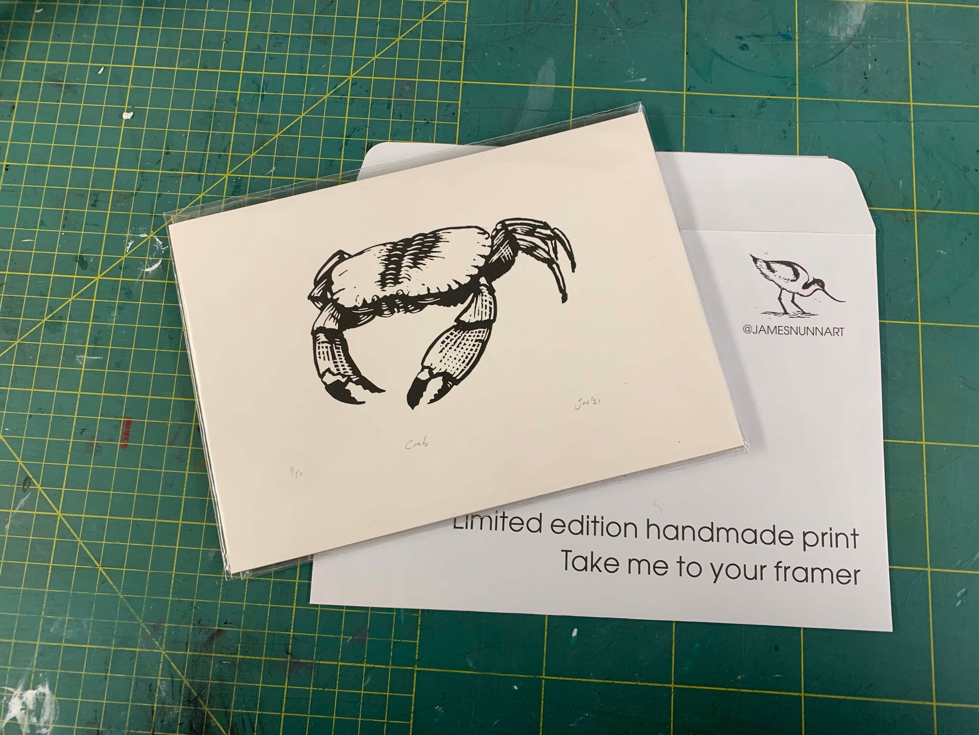 All new for winter 2021, a beautiful handmade limited-edition linocut print of a crab.