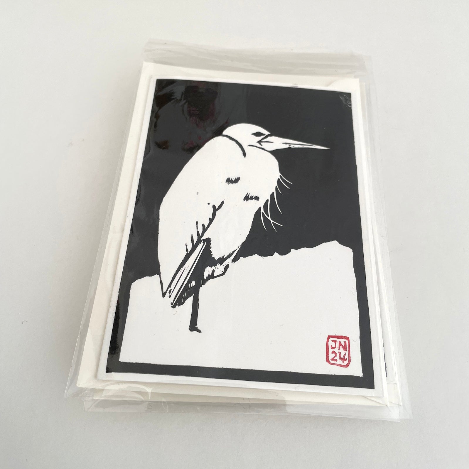 Beautiful, stylish handmade greetings card. This heron is one of six winter themed linocut cards printed by James in the studio.