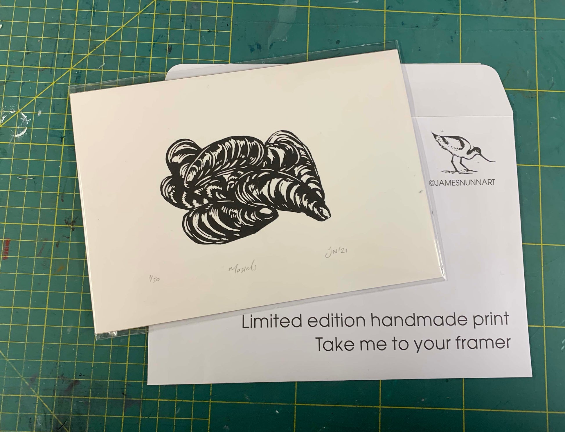 All new for winter 2021, a beautiful handmade limited-edition linocut print of a lovely little pile of Norfolk mussels.