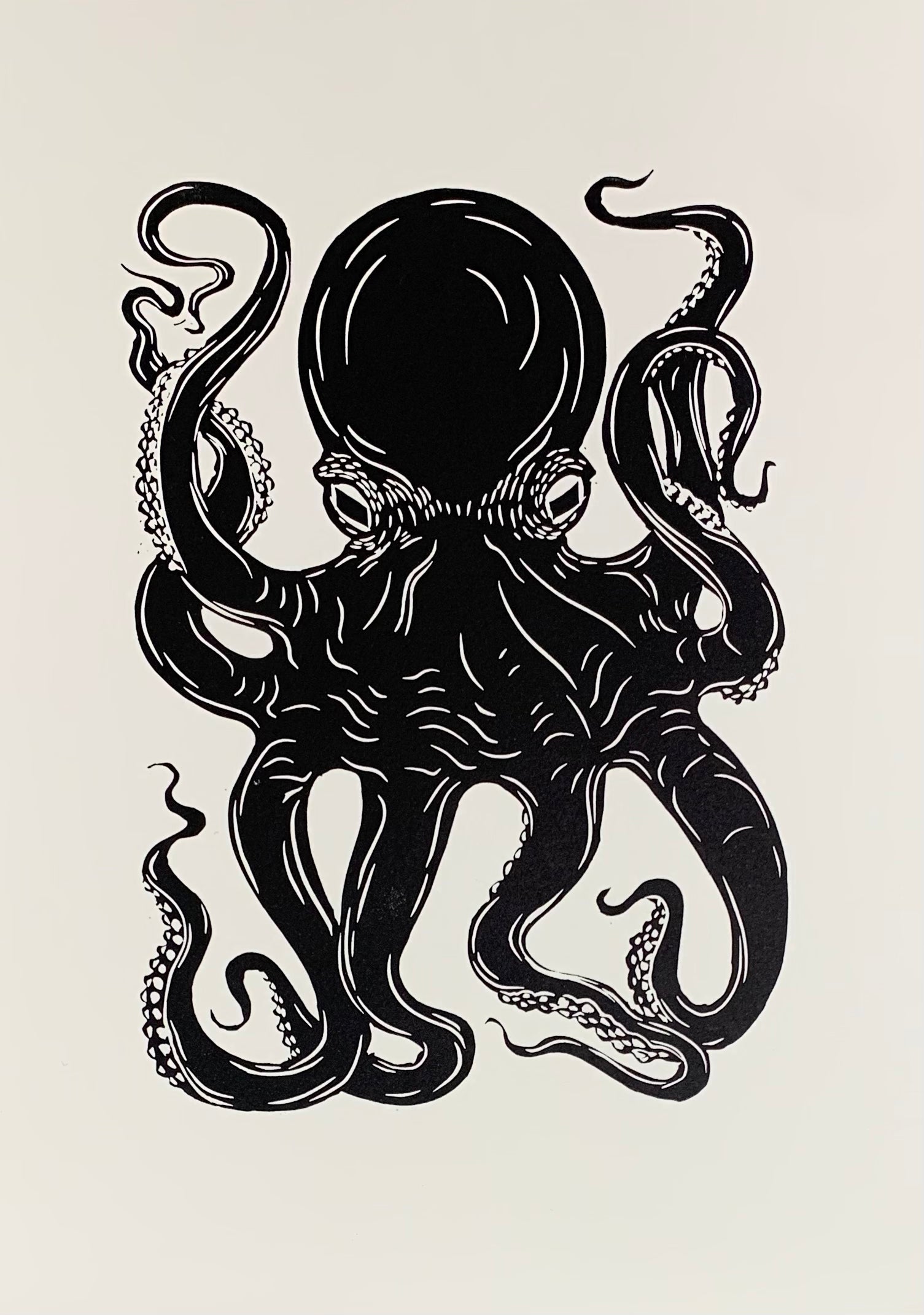 All new for winter 2021, a handmade limited-edition linocut print of a small and exceedingly affordable Octopus, for those that don't have the space or the dosh for one of my big octopuses. Think of this one as the gateway drug for your burgeoning octopus habit.