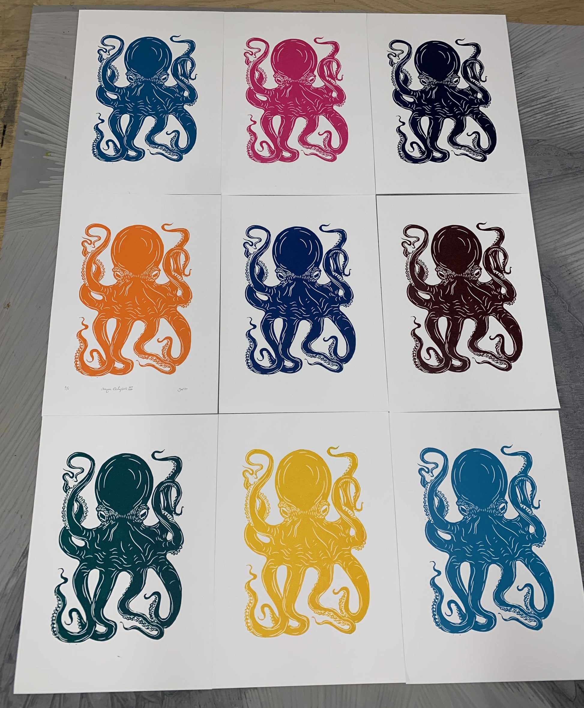 All new for winter 2021, a handmade limited-edition linocut print of a small and exceedingly affordable Octopus, for those that don't have the space or the dosh for one of my big octopuses. Think of this one as the gateway drug for your burgeoning octopus habit.