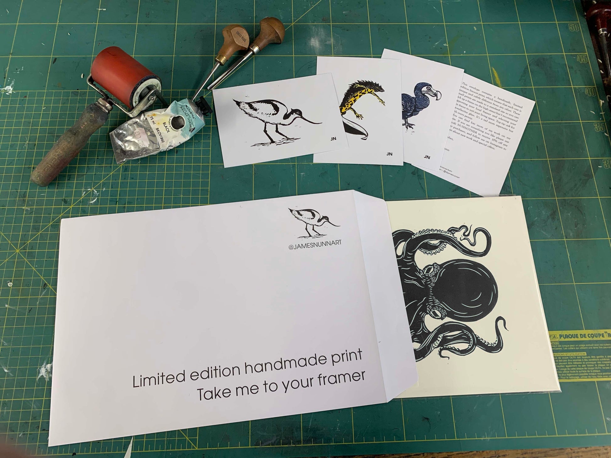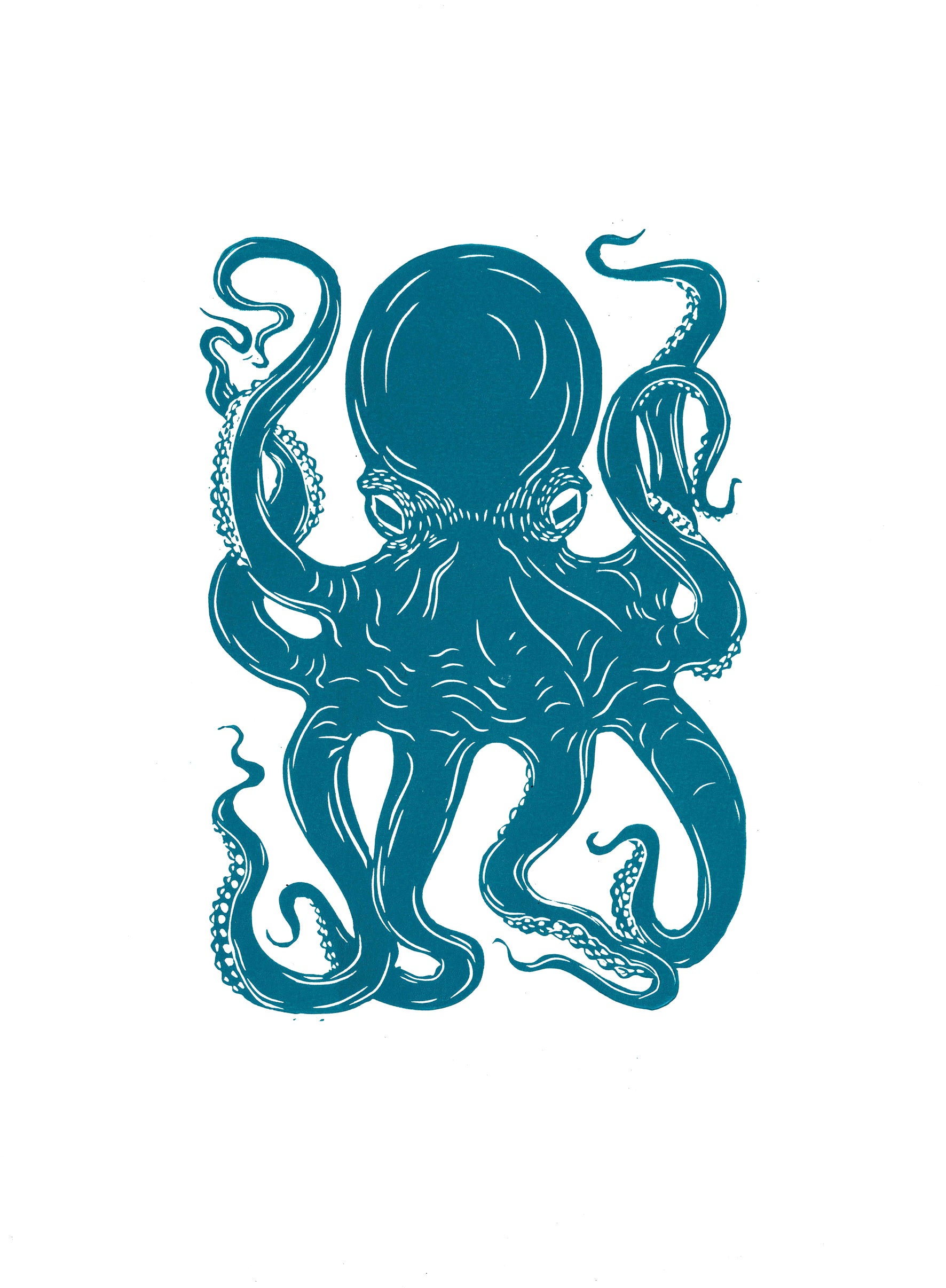 All new for winter 2021, a handmade limited-edition linocut print of a small and exceedingly affordable Octopus, for those that don't have the space or the dosh for one of my big octopuses. Think of this one as the gateway drug for your burgeoning octopus habit.