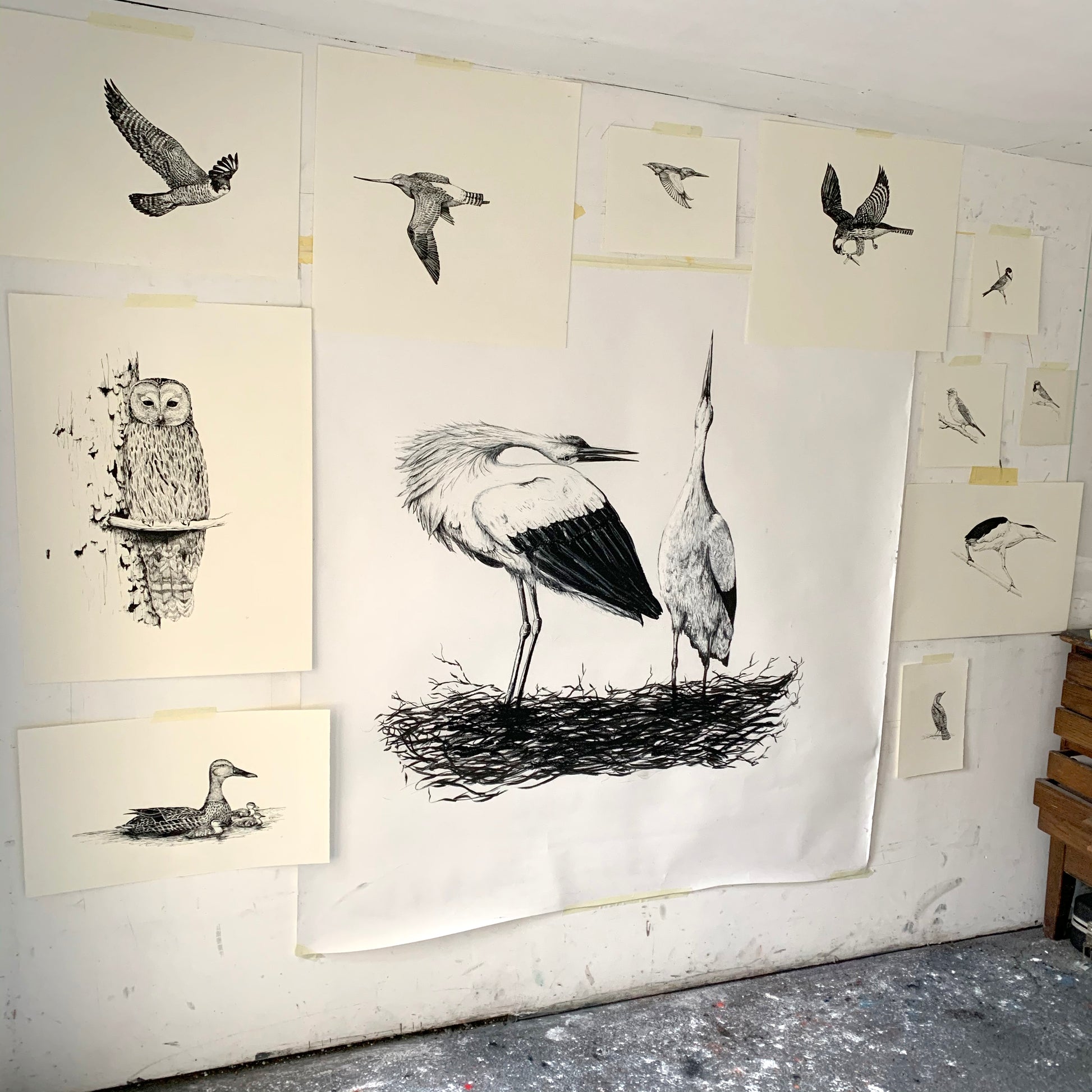 White Storks, Charcoal and white Pastel on paper. Original Illustration from The Birds They Sang by Stanisław Łubieński.